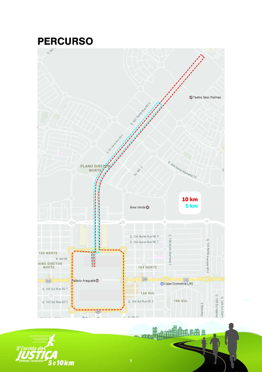 A 3ª edição da Corrida da Justiça tem início às 19 horas e será disputada em duas modalidades: 5 e 10 km. Após a largada, do estacionamento do TJTO, os competidores seguirão pela avenida Teotônio Segurado, sentido região norte. No retorno, quem se inscreveu para o circuito de 5 km volta ao estacionamento do Tribunal para cruzar a linha de chegada. Já quem optou pela prova de 10 km completará o trajeto com uma volta na Praça dos Girassóis.