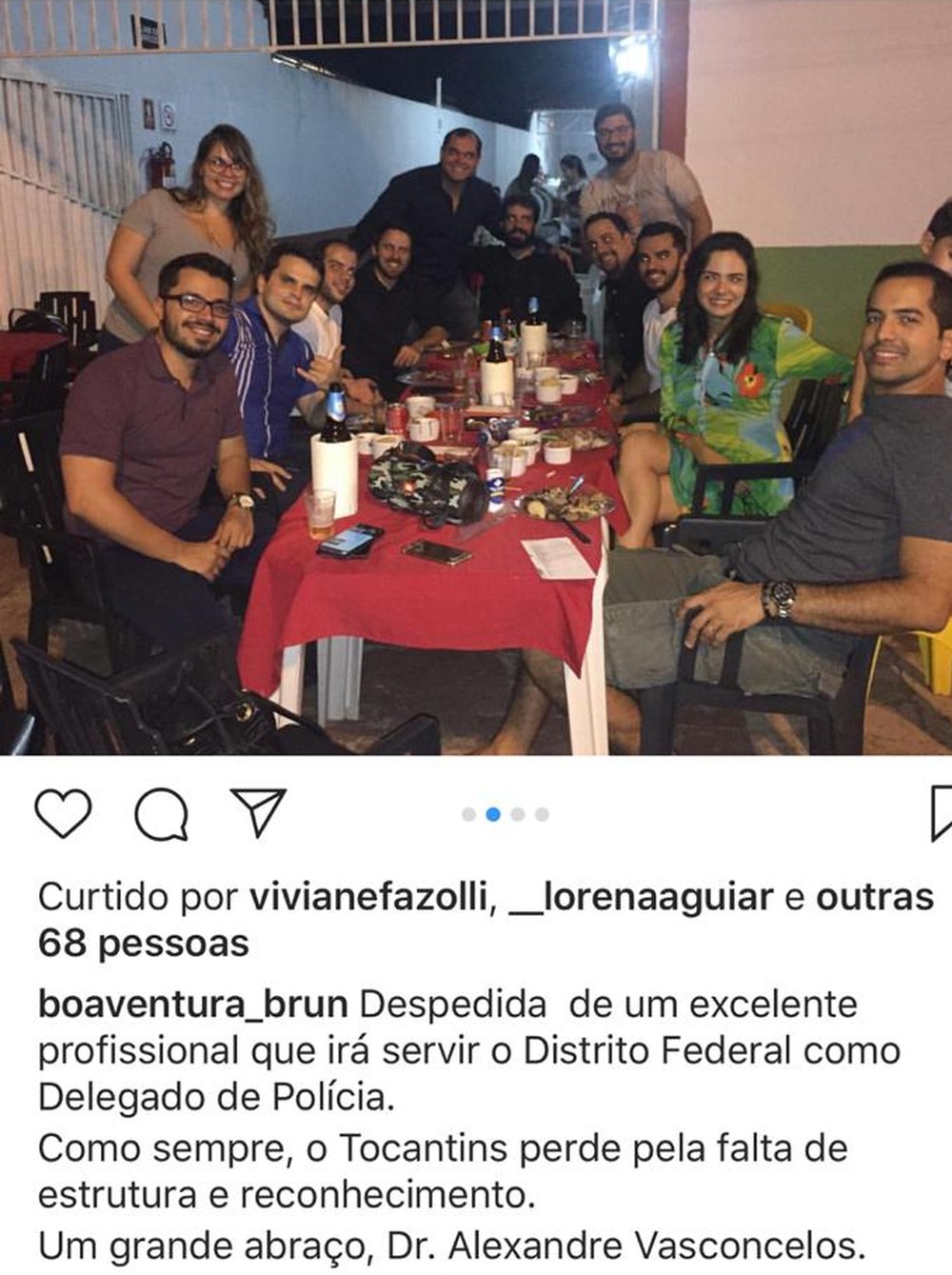 Fotos da despedida foram postadas nas redes sociais de delegados e colegas de Vasconcelos. "Despedida de um excelente profissional que irá servir o Distrito Federal como delegado de polícia [...] Um grande abraço, Dr. Alexandre Vasconcelos", comentou o delegado regional de Araguaína, Bruno Boaventura.