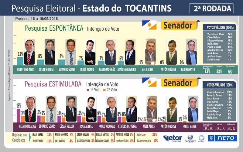Já está disponível no site www.fieto.com.br a pesquisa de intenção de votos nas eleições 2018 para os cargos de governador, senador e presidente da República encomendada pela Federação das Indústrias do Estado do Tocantins (FIETO) e TV Jovem/Record Tocantins ao Instituto VETOR.