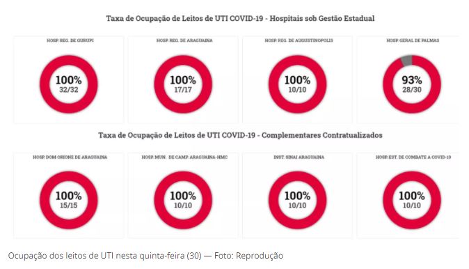 O portal Integra Saúde, da Secretaria Estadual da Saúde, mostra nesta terça-feira (30) que todos os hospitais com leitos de UTI Covid em Araguaína estão com 100% de ocupação.