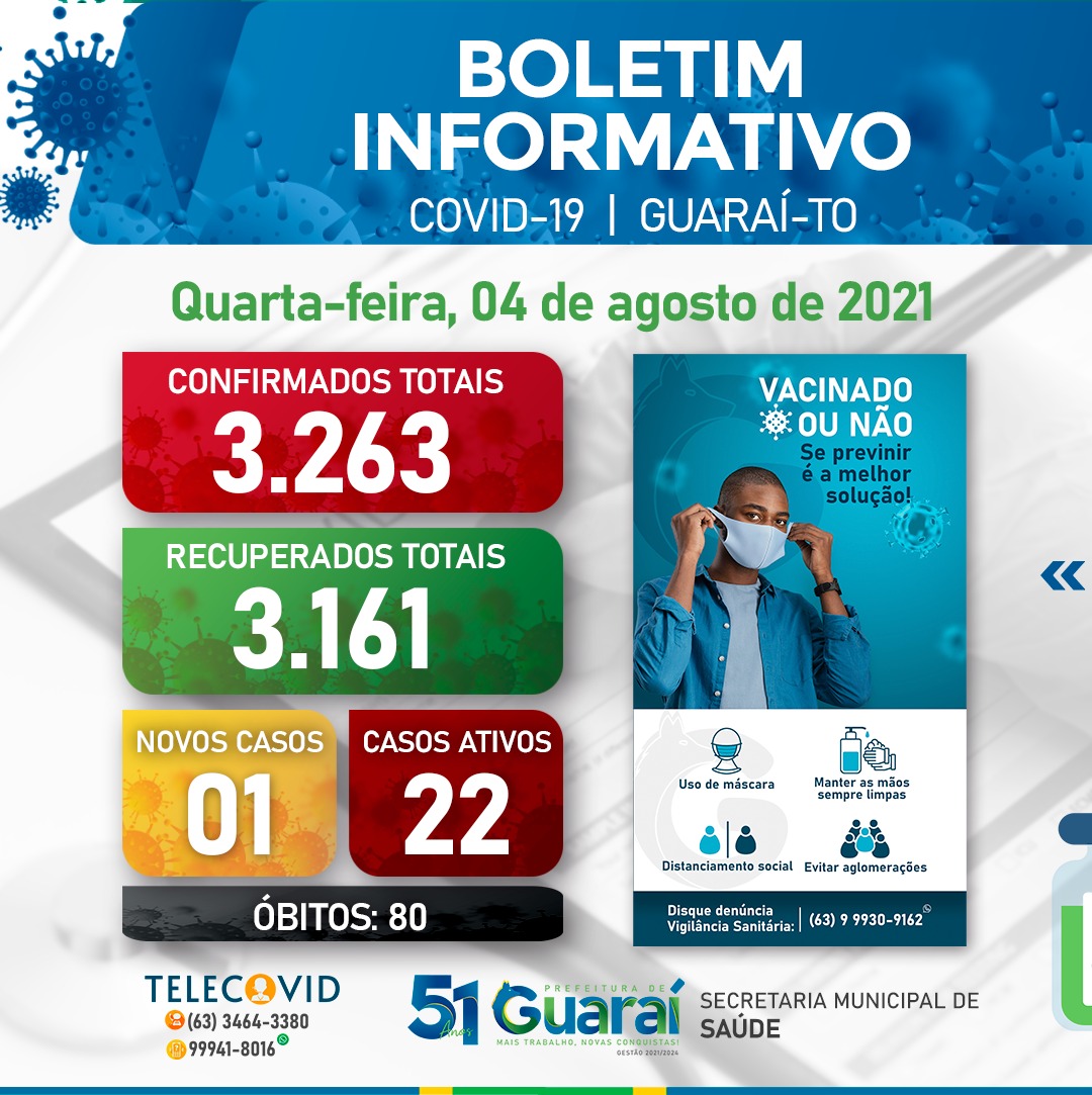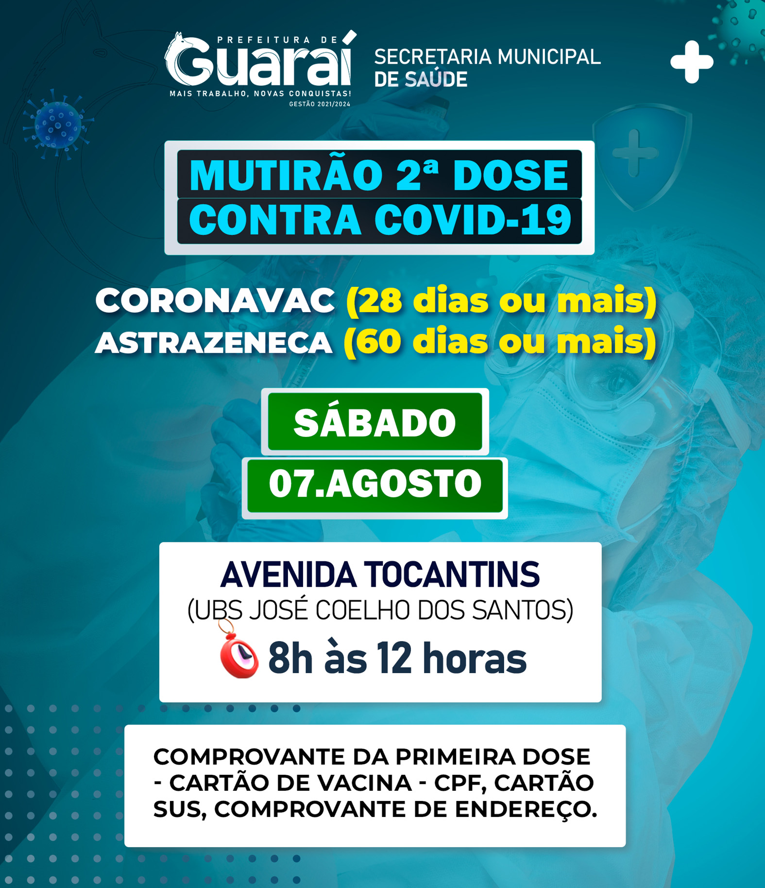 A Secretaria Municipal de Saúde de Guaraí realiza mutirão de vacinação por livre demanda, voltada para o público que precisa tomar a segunda dose da vacina contra a Covid-19. A ação acontece no próximo sábado (07/08), das 8h às 12 horas, na UBS José Coelho dos Santos – Avenida Tocantins.