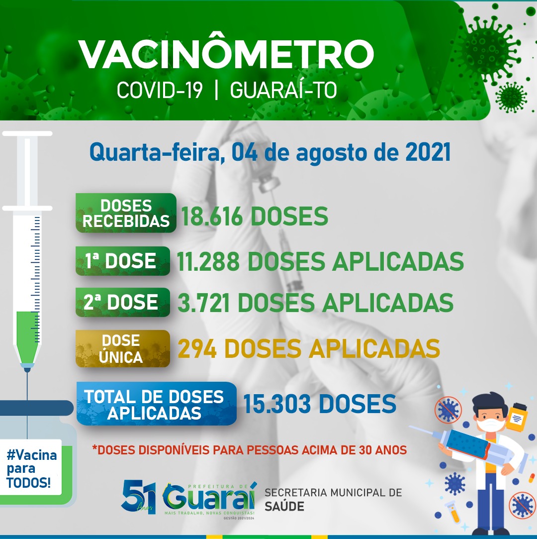 Até hoje, Guaraí alcançou o total de 15.303 doses aplicadas. São 11.288 pessoas imunizadas com a primeira dose e 3.721 com a 2ª. Vale ressaltar que, 290 pessoas receberam a dose única da vacina Janssen, não sendo necessário a segunda dose.