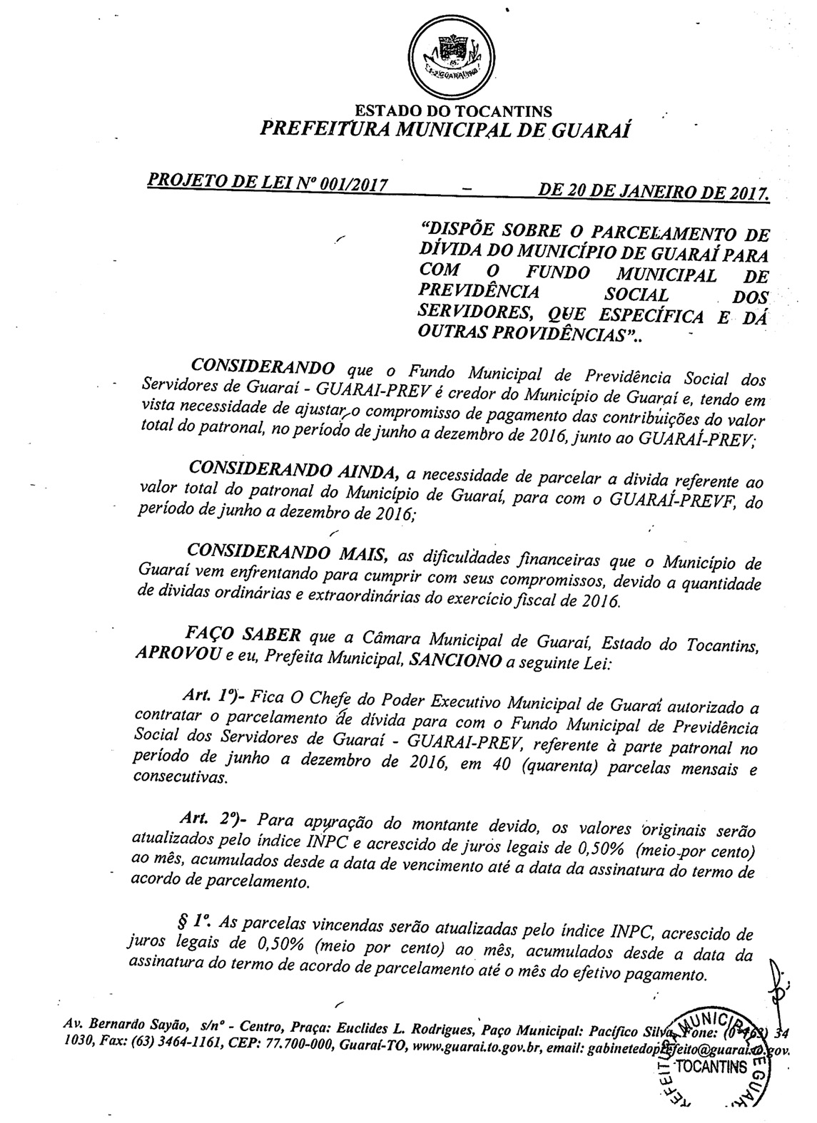 Em janeiro de 2017, a atual gestão encaminhou à Câmara Municipal o Projeto de Lei nº 01/2017, solicitando, o parcelamento dos débitos da Prefeitura para com o GuaraíPrev, relativos, principalmente, à contribuição previdenciária patronal não repassada pela administração do ex-prefeito, do ano de 2016. A soma da dívida, pelos repasses não feitos de junho de 2016 a dezembro do mesmo ano, totalizaram, com juros, R$ 1.115.536,25 milhão. O pagamento foi aprovado pela Câmara, parcelado em 40 vezes, pela Lei 642/2017, de 01/02/2017.