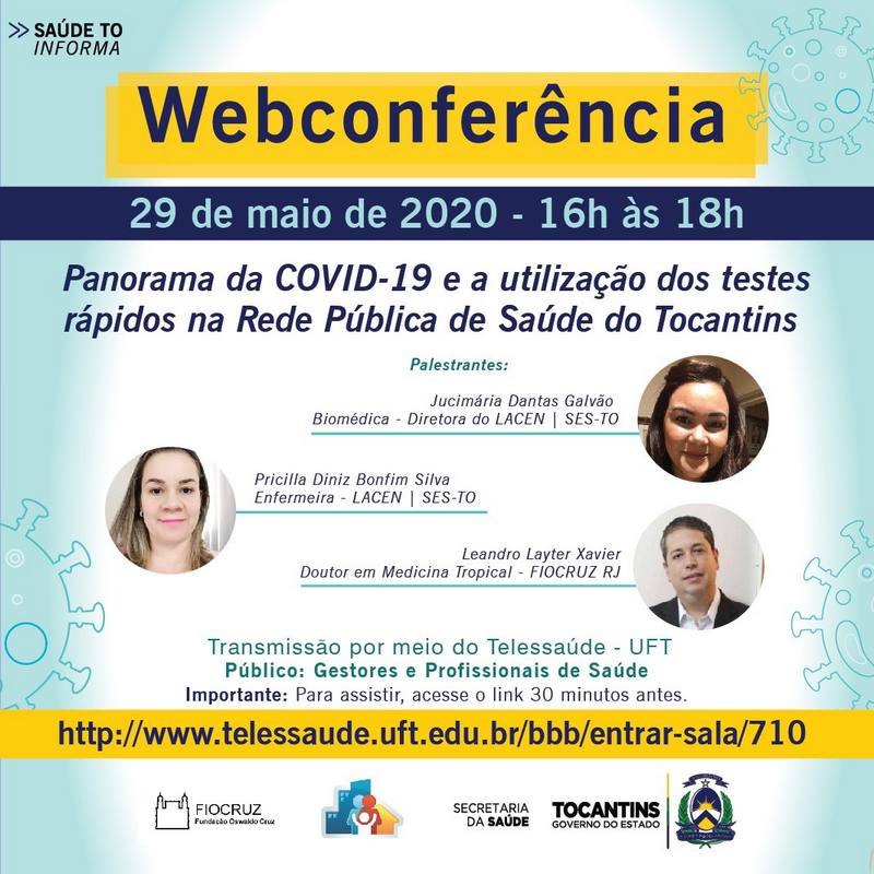 Com o intuito de capacitar os servidores sobre a situação da Covid-19 no Estado, a Secretaria de Estado da Saúde (SES) em parceira com a Fundação Oswaldo Cruz (Fiocruz) realizará na próxima sexta-feira, 29, das 16h às 18h uma webconferência com o tema “Panorama da COVID-19 e a utilização dos testes rápidos na Rede Pública de Saúde do Tocantins”. O público-alvo da videoconferência são gestores e profissionais de saúde.
