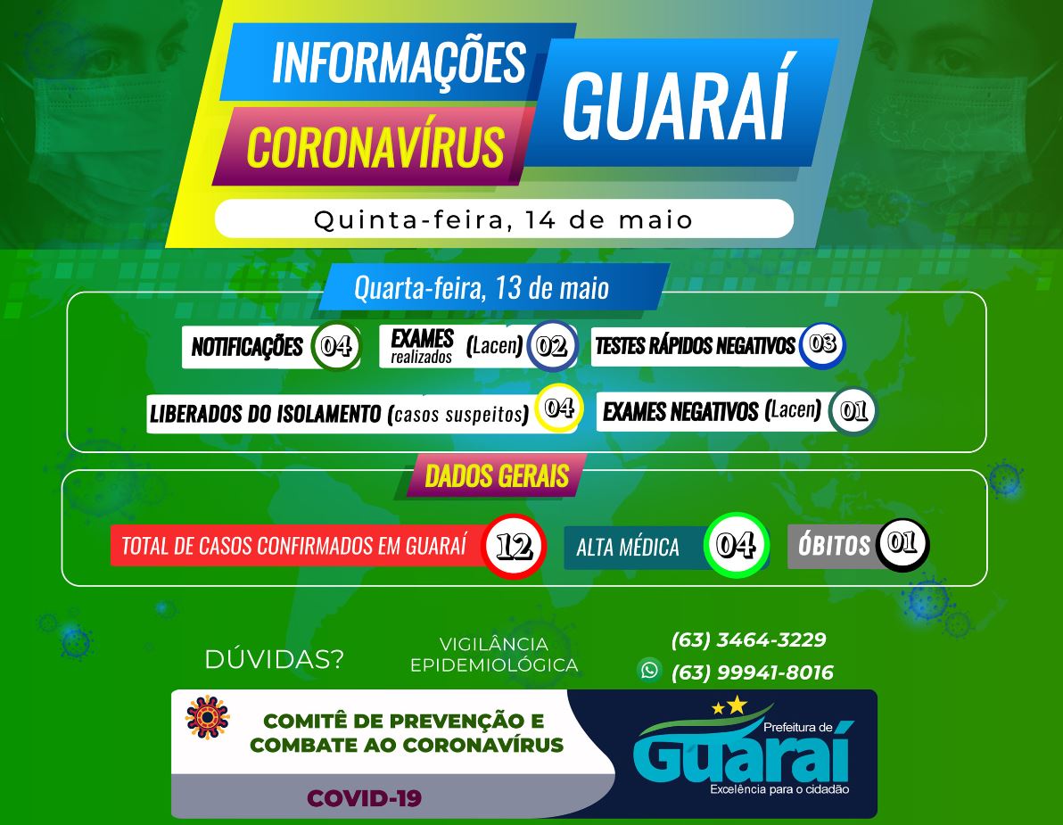 A Vigilância Epidemiológica de Guaraí informou que nesta quarta-feira, 13, foram 4 notificações no Hospital Regional de Guaraí (HRG). 2 exames foram realizados e encaminhados para análise ao Lacen, 3 testes rápidos (negativos) e o resultado de um exame negativo pelo Lacen.