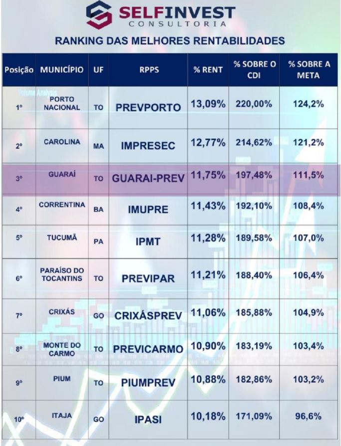 O GuaraíPREV - fundo previdenciário do município - apresentou desempenho da carteira de investimentos e apareceu em 3º lugar nas 10 maiores rentabilidades entre clientes da Self Assessoria e SelfInvest Consultoria. O avanço é referente ao acumulado de 2019 e foi analisado entre municípios dos estados de Tocantins, Maranhão, Bahia, Pará e Goiás.