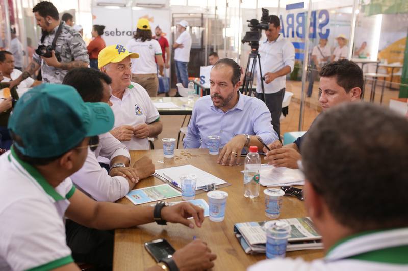 Depois de percorrer os estandes da feira, Moisés Gomes recebeu o secretário estadual de Indústria, Comércio e Serviços, Ridoval Darci Chiareloto, o prefeito de Mateiros, João Martins Neto; Heverson Martins, secretário de desenvolvimento econômico, Meio Ambiente e Turismo de Mateiros; Douglas Rocha, assessor do deputado Irajá Abreu e o presidente da Agência do Desenvolvimento do Turismo, Cultura e Economia Criativa (Adetuc), Tom Lyra. Durante o encontro foram discutidos assuntos como o turismo na região do Jalapão, exportações no Tocantins e apoio aos pequenos negócios.