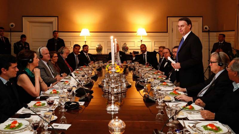 A primeira atividade de Jair Bolsonaro em Washington, onde o presidente desembarcou neste domingo (17), foi um jantar com conservadores norte-americanos na casa do embaixador brasileiro no país, Sergio Amaral. As presenças de destaque foram a do estrategista Steve Bannon, ex-assessor de Trump, e a do escritor Olavo de Carvalho, tido como mentor intelectual do atual governo.