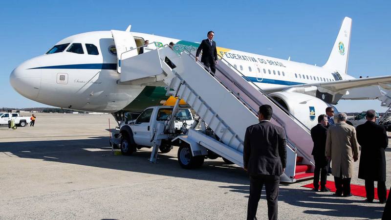 Jair Bolsonaro pousou às 15h40 (16h40 no horário de Brasília) neste domingo (17) na base da força aérea americana Andrews, a cerca de 23 km do centro de Washington, nos Estados Unidos.