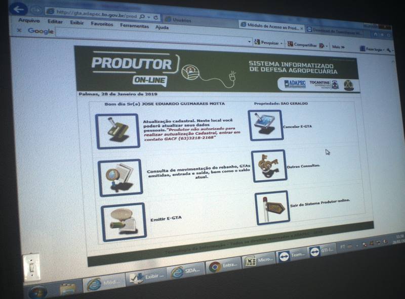 Em breve, os produtores rurais tocantinenses terão a opção de gerar a Guia de Trânsito Animal eletrônica (e-GTA) sem sair de sua propriedade, o projeto piloto começou a ser testado, na segunda-feira, 28, na sede da Agência de Defesa Agropecuária (Adapec), em Palmas, com a participação do representante das fazendas do Grupo Agrojem, Breno Germanos. A previsão é de que até 15 de fevereiro, o sistema esteja liberado pra todos. O Tocantins tem mais de 56 mil produtores rurais ativos na exploração pecuária.