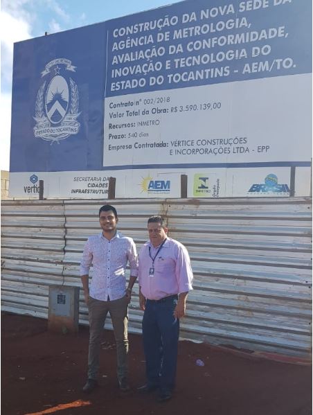 Com a previsão de entrega para dezembro de 2019, as obras da sede própria da Agência de Metrologia, Avaliação da Conformidade, Inovação e Tecnologia do Estado do Tocantins (AEM-TO) receberam a visita dos engenheiros do Instituto Nacional de Metrologia, Qualidade e Tecnologia (Inmetro) Leonardo Trajano de Menezes e Rogério Mendes Quintella, que vieram para a medição e conferência do andamento do projeto.