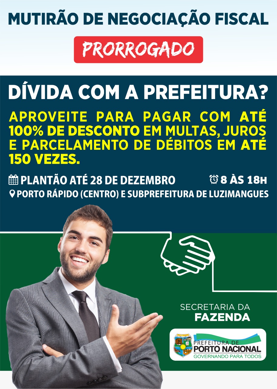 O Mutirão de Negociação Fiscal da Prefeitura de Porto Nacional, em parceria com o Conselho Nacional de Justiça (CNJ), foi até o dia 28 de dezembro para oportunizar mais uma chance aos contribuintes. A campanha concede descontos em juros e multas que podem chegar até 100% e parcelar débitos em até 150 vezes, de acordo com a Lei 2376/17.