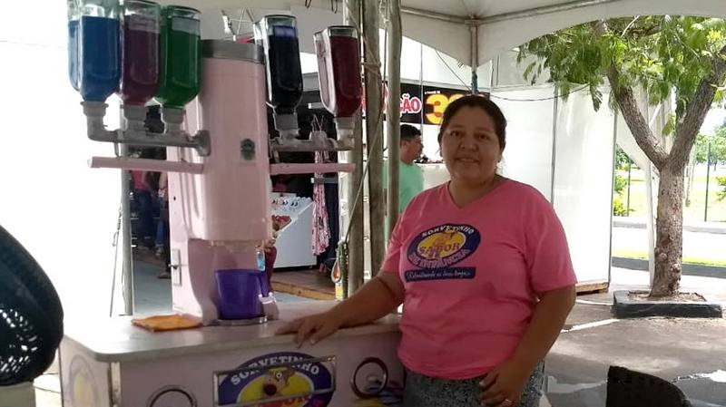 Sorvete de pecuária, sorvete de rodoviária, sorvete da infância, seja lá como as pessoas o definem, o popular sorvete americano é o ganha pão da vendedora ambulante, Cristiane Rodrigues, que mora no município de Paraíso, a cerca de 60 Km de distância de Palmas. Cristiane já aproveitou alguns eventos na Capital para vir levantar um dinheiro e, desta vez, ela instalou uma de suas máquinas de sorvete americano no Parque Cesamar, um dos pontos do Circuito Natalino. “Este mês, por ter outros eventos além do Natal Cidade Encantada no Cesamar, optei por alugar uma kitnet e está valendo a pena. Tenho um público cativo e não é de crianças, quem mais nos procuram são os adultos, até criamos um grupo no WhatsApp onde atualizo minha agenda em Palmas e o lucro tem sido muito bom”, comemora a vendedora.