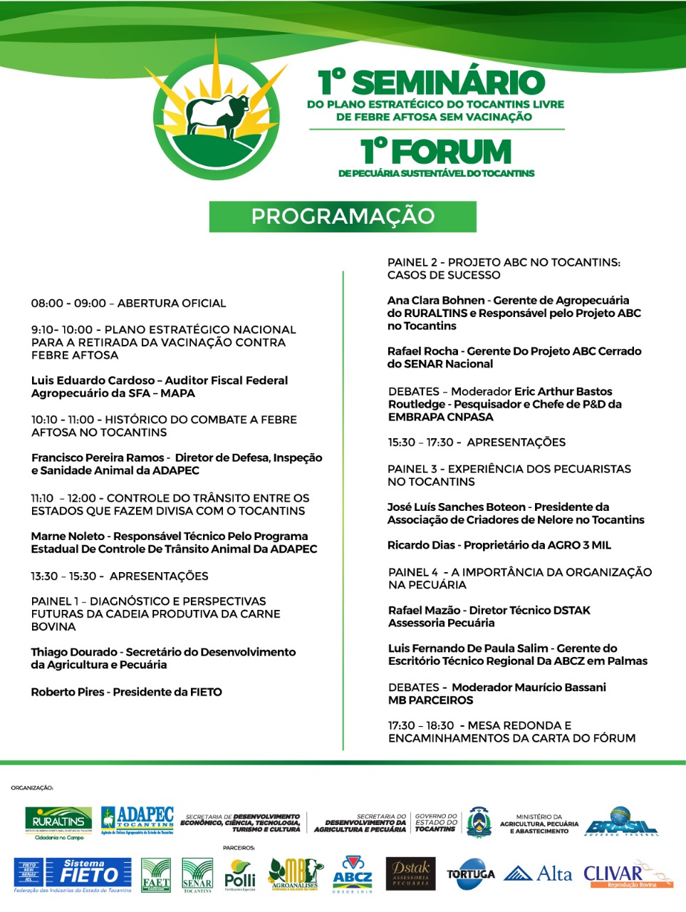 No período da tarde serão abordados os temas: Diagnósticos e perspectivas futuras da cadeia produtiva da carne bovina; Projeto ABC no Tocantins; Experiências dos pecuaristas do Tocantins; A importância da organização na pecuária, entre outros.